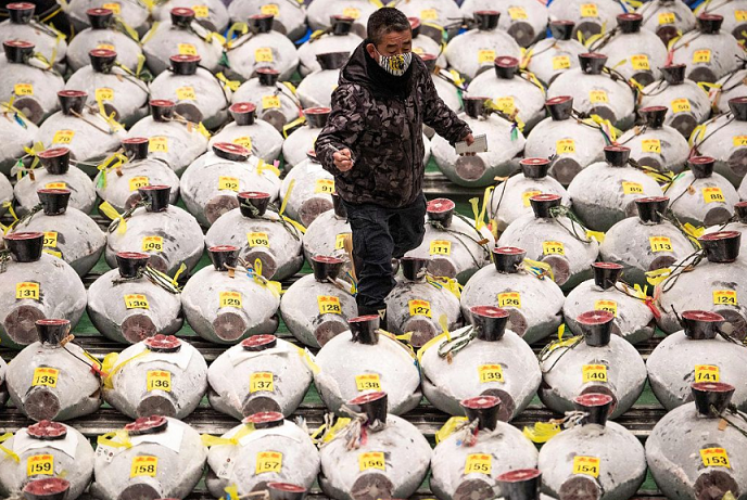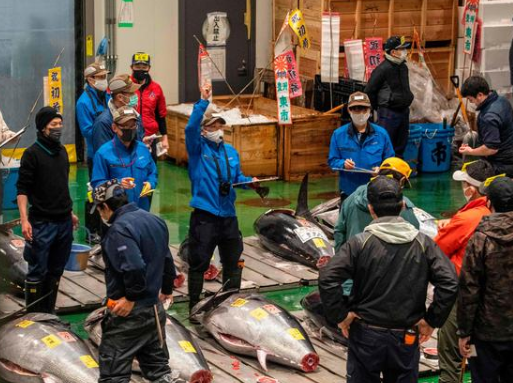在往年新年首日的鱼市拍卖会上,为了祈愿当年生意兴隆、讨个好彩头,买家通常愿意给出高于平常的价钱参与竞拍。受疫情影响,今年不仅金枪鱼拍出了“白菜价”,河豚、鰤鱼等海产品的成交价格也低于往年。