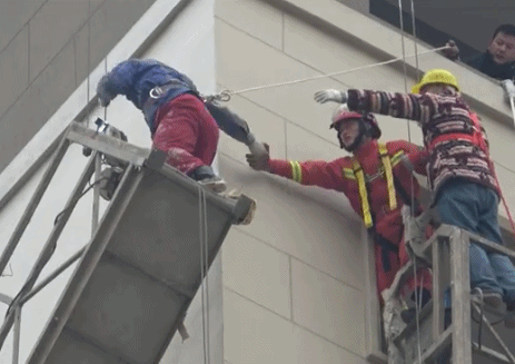 消防员紧急救援,先给被困者做好防坠保护,然后利用另一部吊篮将保险腰带传递给被困人员,最终顺利救下两名被困工人。