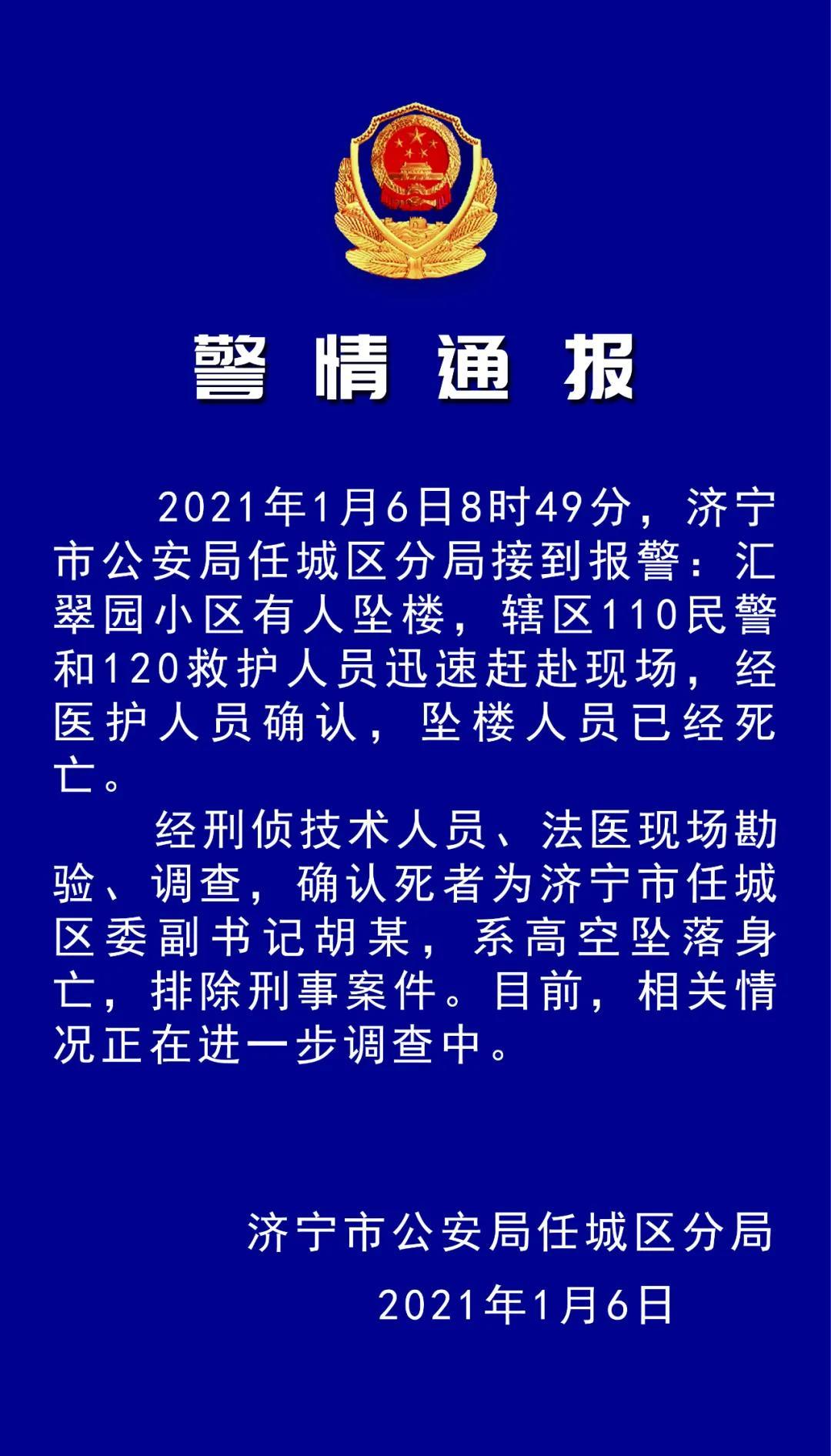 山东济宁任城区委副书记胡某坠楼身亡,警方:排除刑案