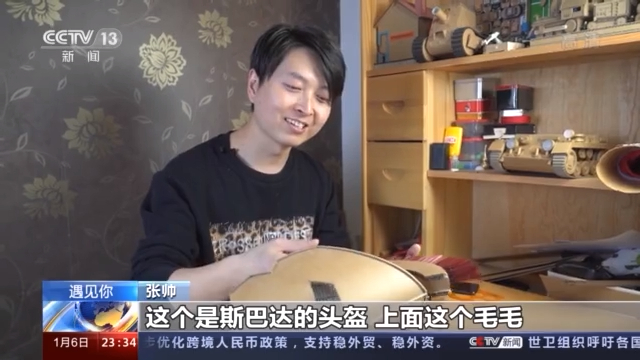 张帅:宝剑、剑身各方面都是用收快递的废旧纸箱,上边装饰了一下,用弹珠当作宝石,这个是斯巴达的头盔,这个上面这个毛毛(利用)家里边的(废旧)扫把,在上面装饰了一下。我们两个可以一块去玩,她会特别开心。