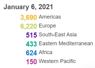 根据世卫组织最新实时统计数据,截至欧洲中部时间1月6日17时20分(北京时间1月7日0时20分),全球累计新冠肺炎确诊病例85091012例,累计死亡病例1861005例。