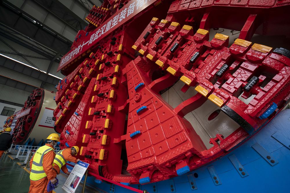 2020年12月26日,中铁十一局两名职工在放置大型盾构机的标牌。当日,在武汉市黄陂区临空产业园中铁十一局武汉重型装备有限公司,两台大型盾构机正式下线,标志着该公司正式落成投产。(新华社记者 杜华举 摄)