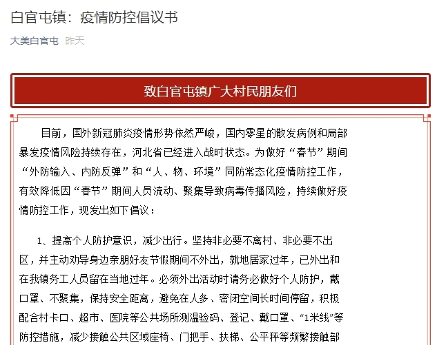 1月7日,唐山市丰润区白官屯镇疫情防控办公室发布的《白官屯镇:疫情防控倡议书》建议,提高个人防护意识,减少出行。坚持非必要不离村、非必要不出区,并主动劝导身边亲朋好友节假期间不外出,就地居家过年,已外出和在我镇务工人员留在当地过年。
