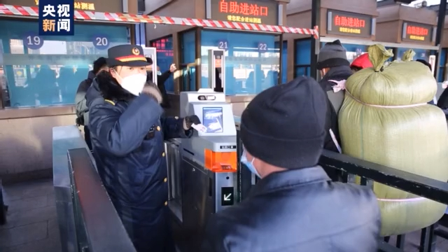 总台央视记者 李娟:这里是北京站的进站口,现在是下午六点多,从我手机里的温度计看到现在是零下十七度,但是由于这里是个广场有穿堂风所以站在这里的温度感受会更冷些,但是我们看到现场依然有很多工作人员在坚守。