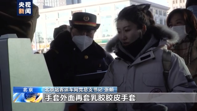 北京站客运车间党总支书记 张頔:有。首先我们发的这个脖套,发的手套,然后还有一些防疫要求,这手套外面再套乳胶胶皮手套,然后给大家再发一点暖宝宝贴在身上,这样能够起一个发热的作用,然后换岗的时间频次多一点,进屋喝点热水,这样的话能稍微的暖和一点。