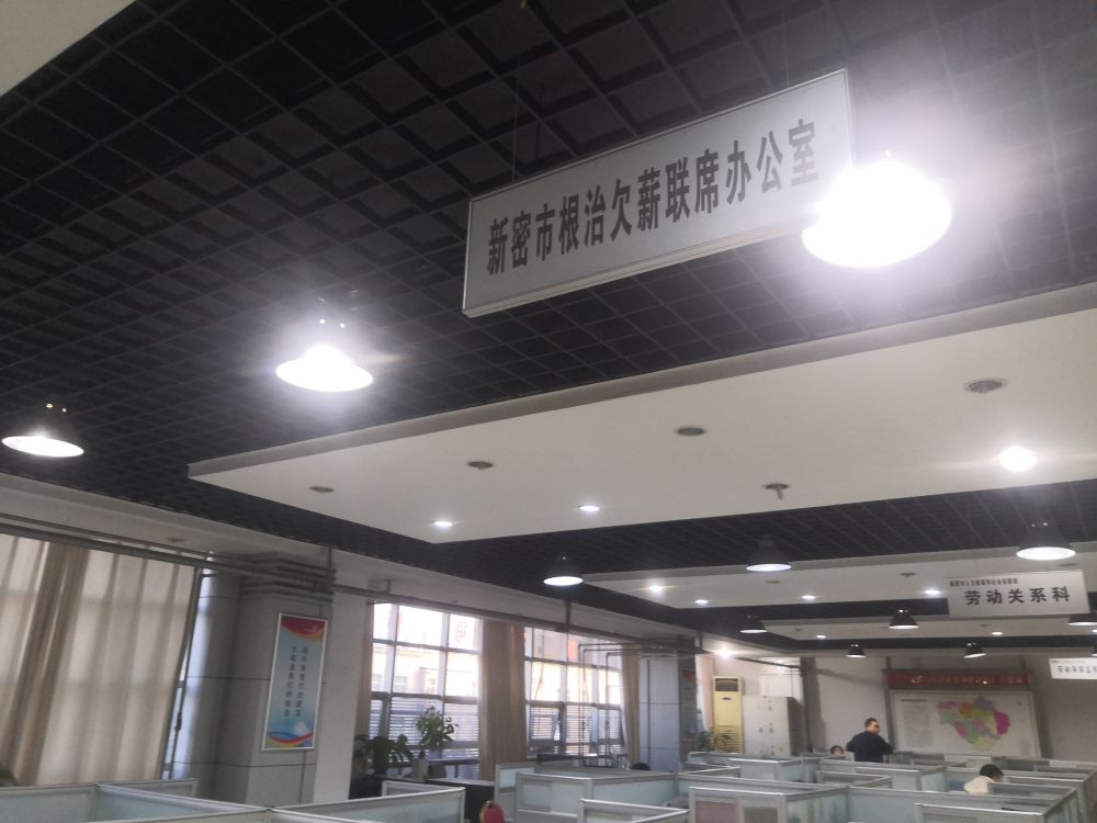 在新密市劳动保障监察大队,一位值班的工作人员称领导们都下去办理欠薪案件了。记者看到,劳动保障监察大队的几个办公室都悬挂着“新密市根治欠薪联席办公室”的牌子,一个办公室里整齐地摆放着住建局、水利局、信访局等部门的桌签,但没有工作人员。
