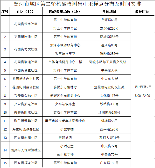 据“黑河宣传”微信公众号消息,黑河市应对新型冠状病毒感染肺炎疫情工作领导小组指挥部通报,7日,黑河市将进行第二轮全民核酸检测。各社区采样点将于1月7日至9日,每日8时至22时,采取分区域、分时段有序进行核酸采样,请广大市民合理安排时间,依次分批到采样点配合完成采集工作,听从并配合社区工作人员指引,避免发生拥挤。