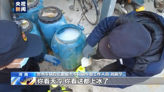 郑州车辆段后勤服务车间刷车组工作人员 刘新学:你看天冷,这都上冰了,刚给它化开。