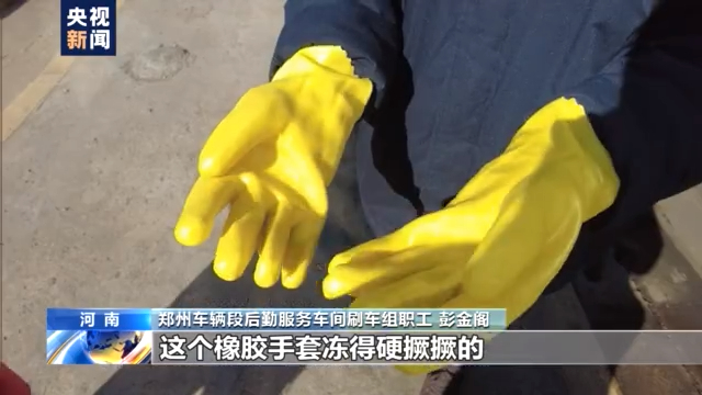 郑州车辆段后勤服务车间刷车组职工 彭金阁:这个就是用不了几天,尤其是冬天,这个橡胶手套,冻得硬撅撅的,它容易烂,你像那种线手套 容易湿。