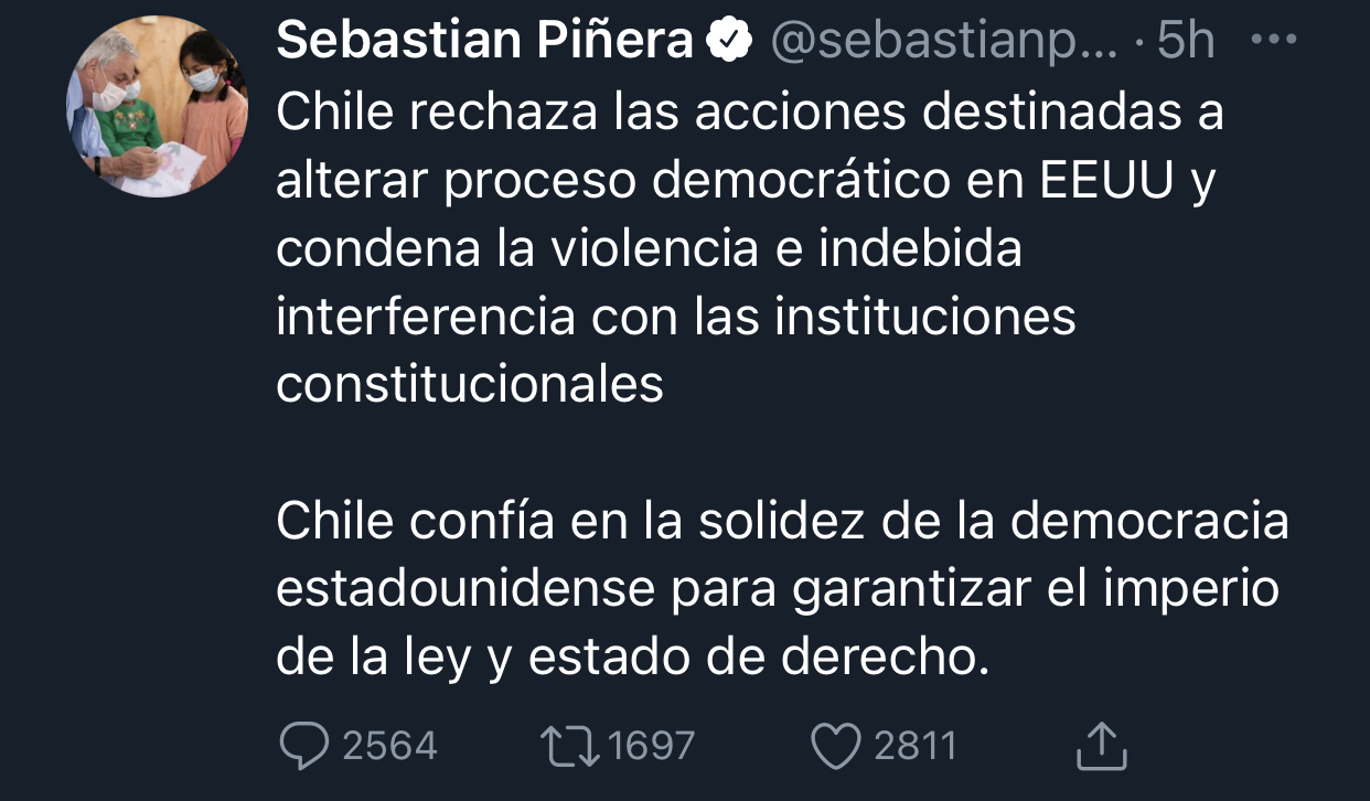 当地时间6日晚,智利总统皮涅拉在其个人社交媒体上发文,就当天发生在美国国会大厦的抗议冲突事件作出表态。