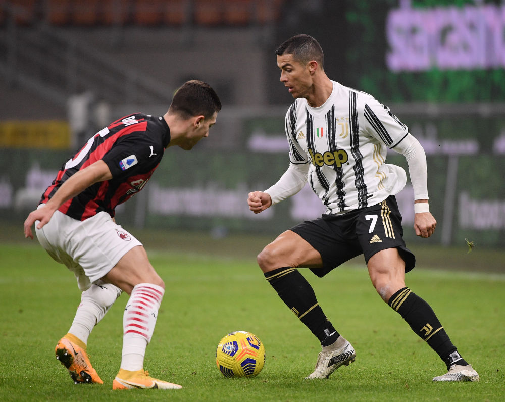 1月6日,尤文图斯队球员克·罗纳尔多(右)与AC米兰队球员达洛特在比赛中拼抢。新华社发(费代里科·塔尔迪托摄)