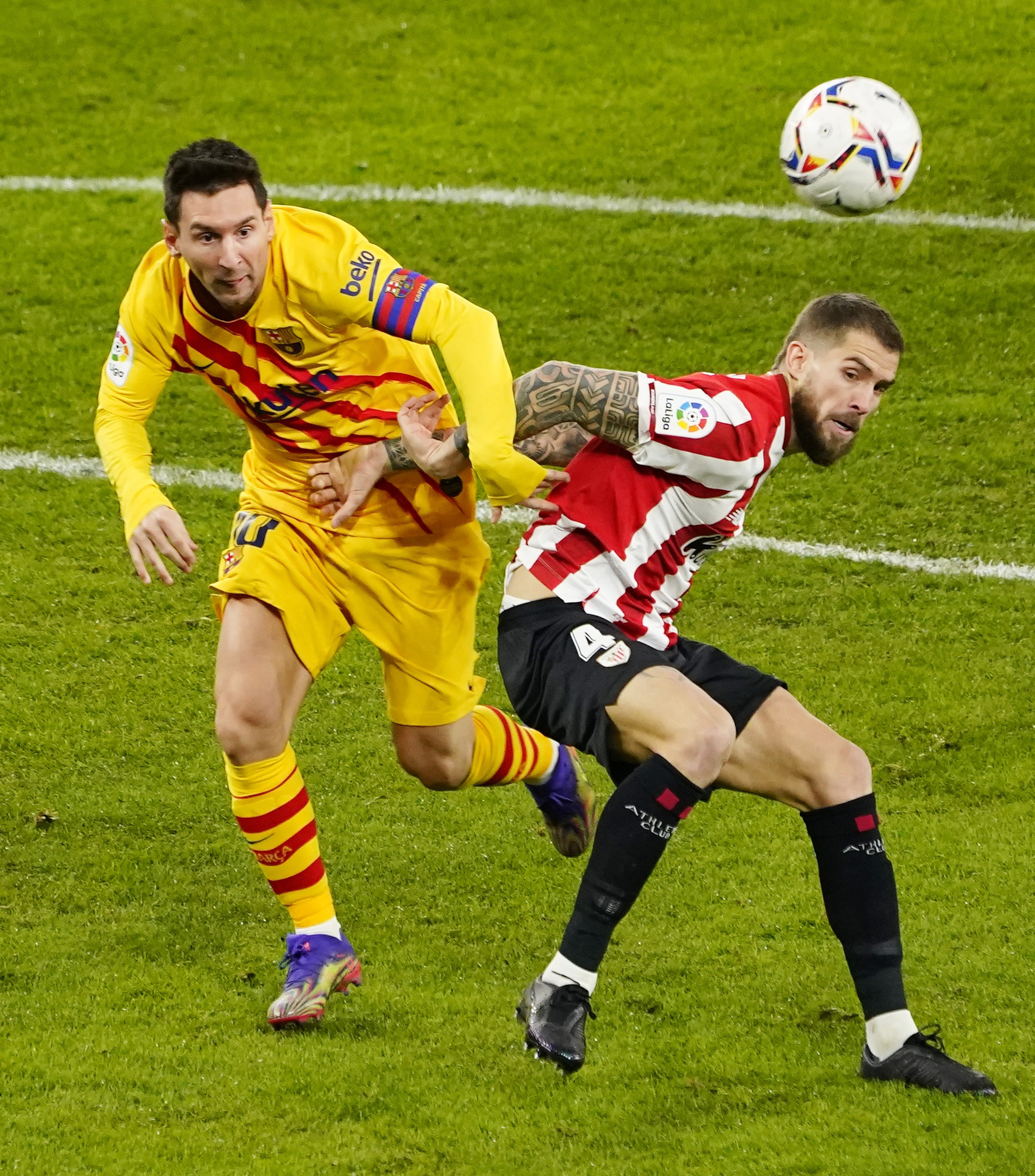 1月6日,巴塞罗那队球员梅西(左)与毕尔巴鄂竞技队球员马丁内斯拼抢。
