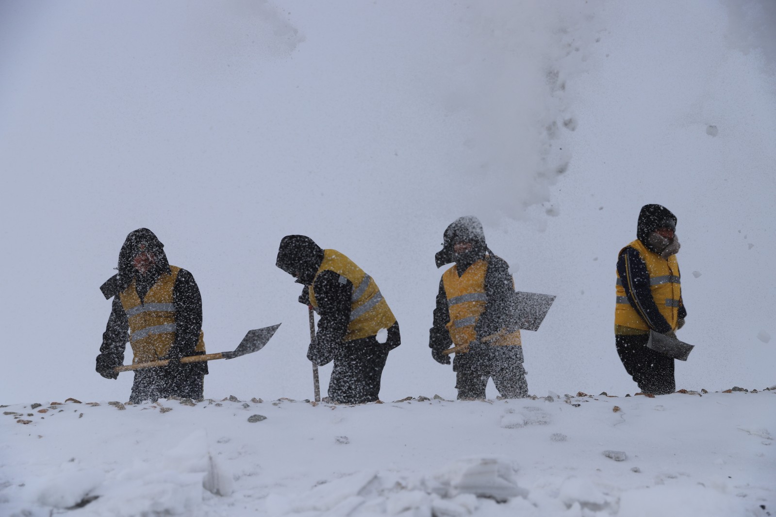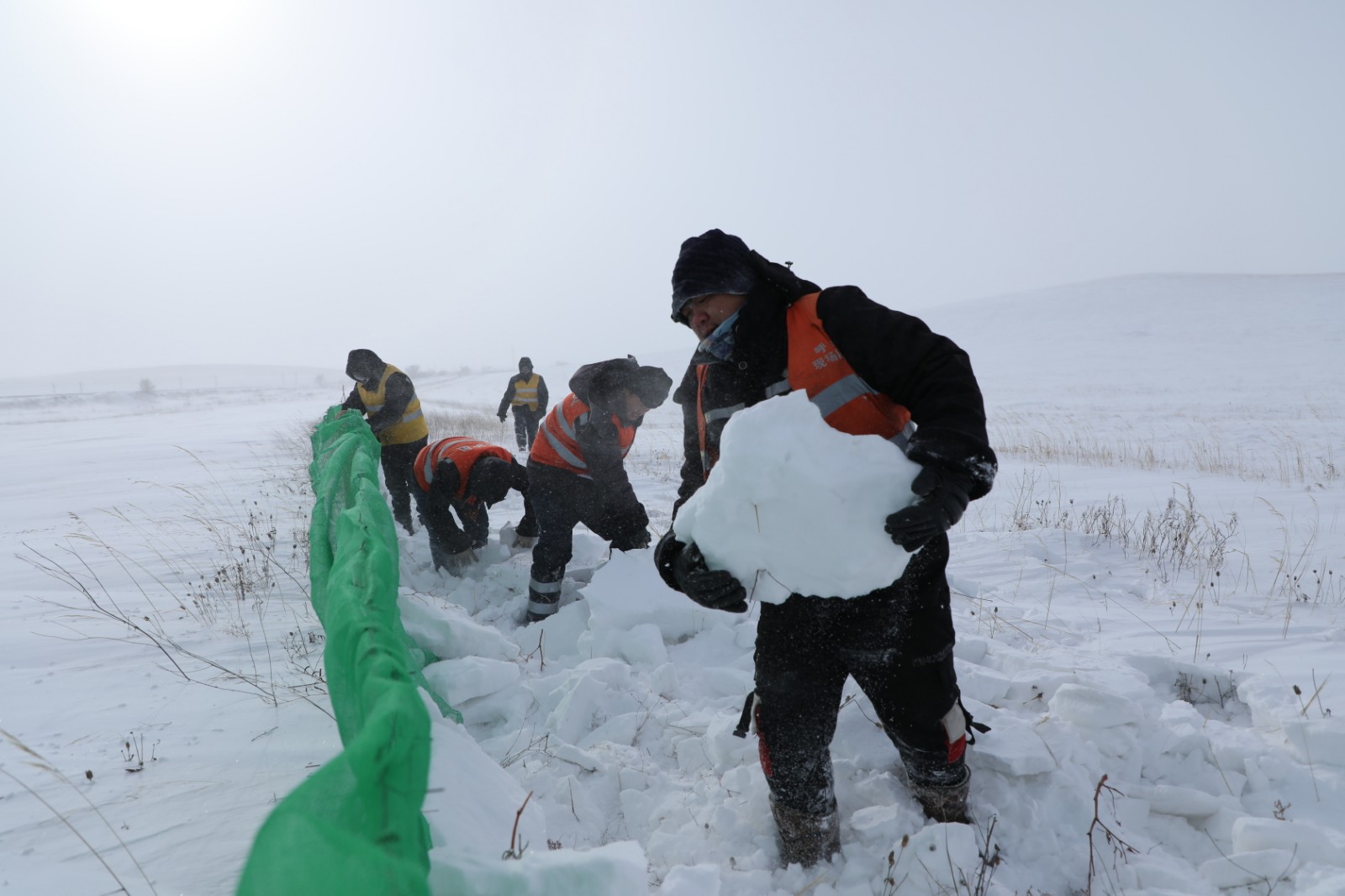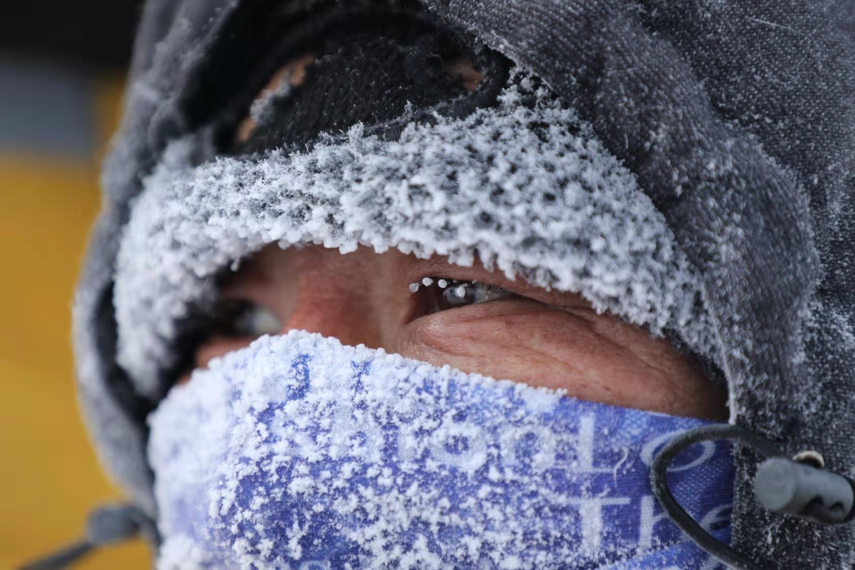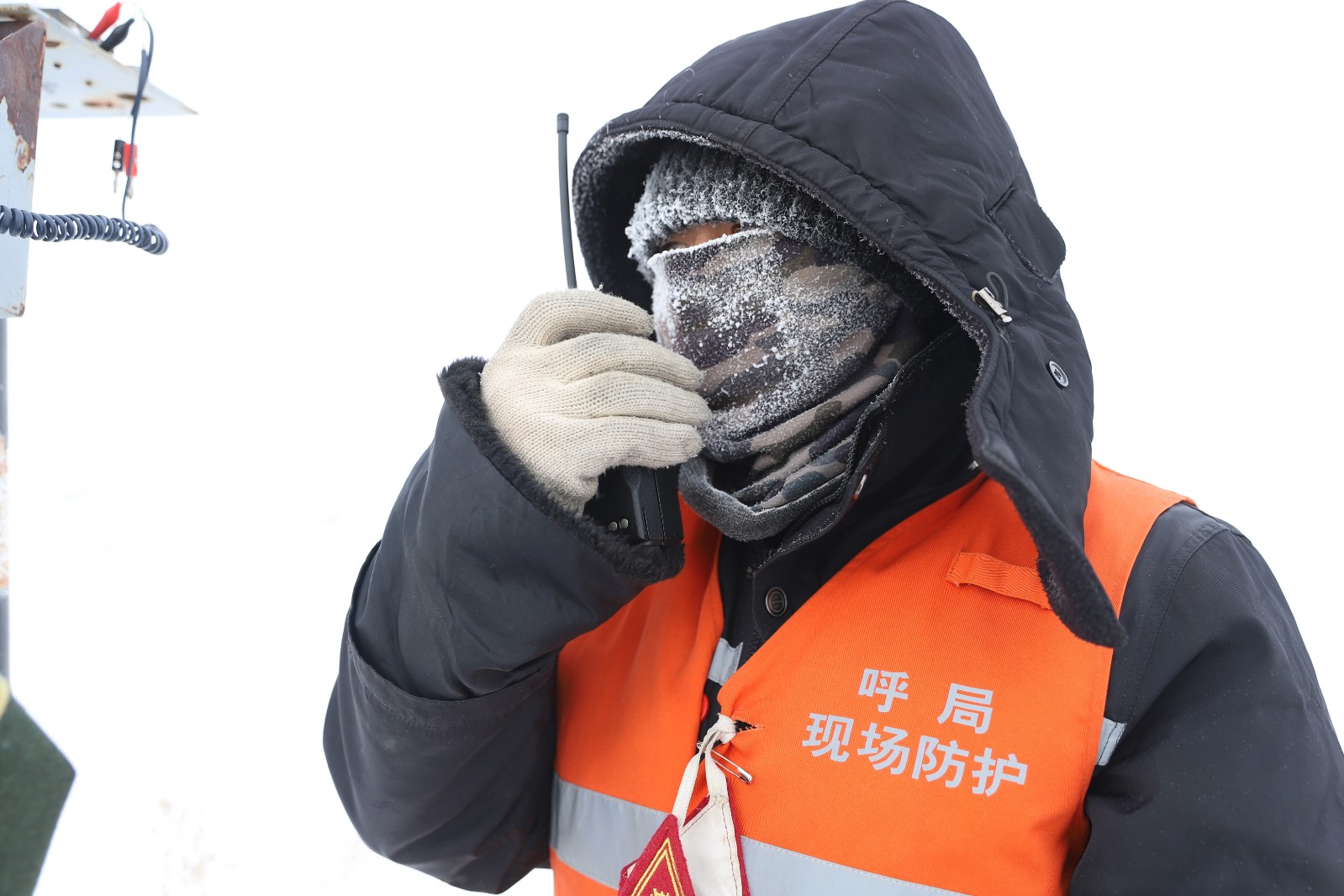 图为1月6日,中国铁路呼和浩特局集团公司锡林浩特综合维修段工人在严寒中检查维护铁路,帽子和面罩上挂满冰霜。(人民日报客户端内蒙古频道 张枨 杨庆臣)