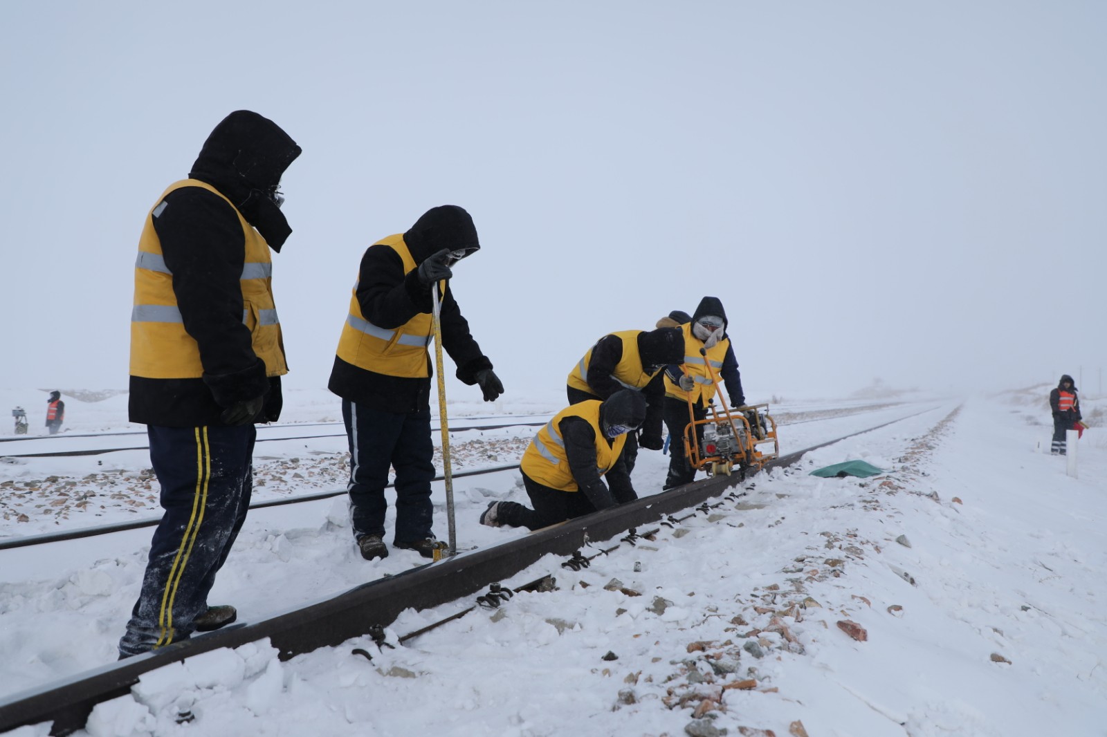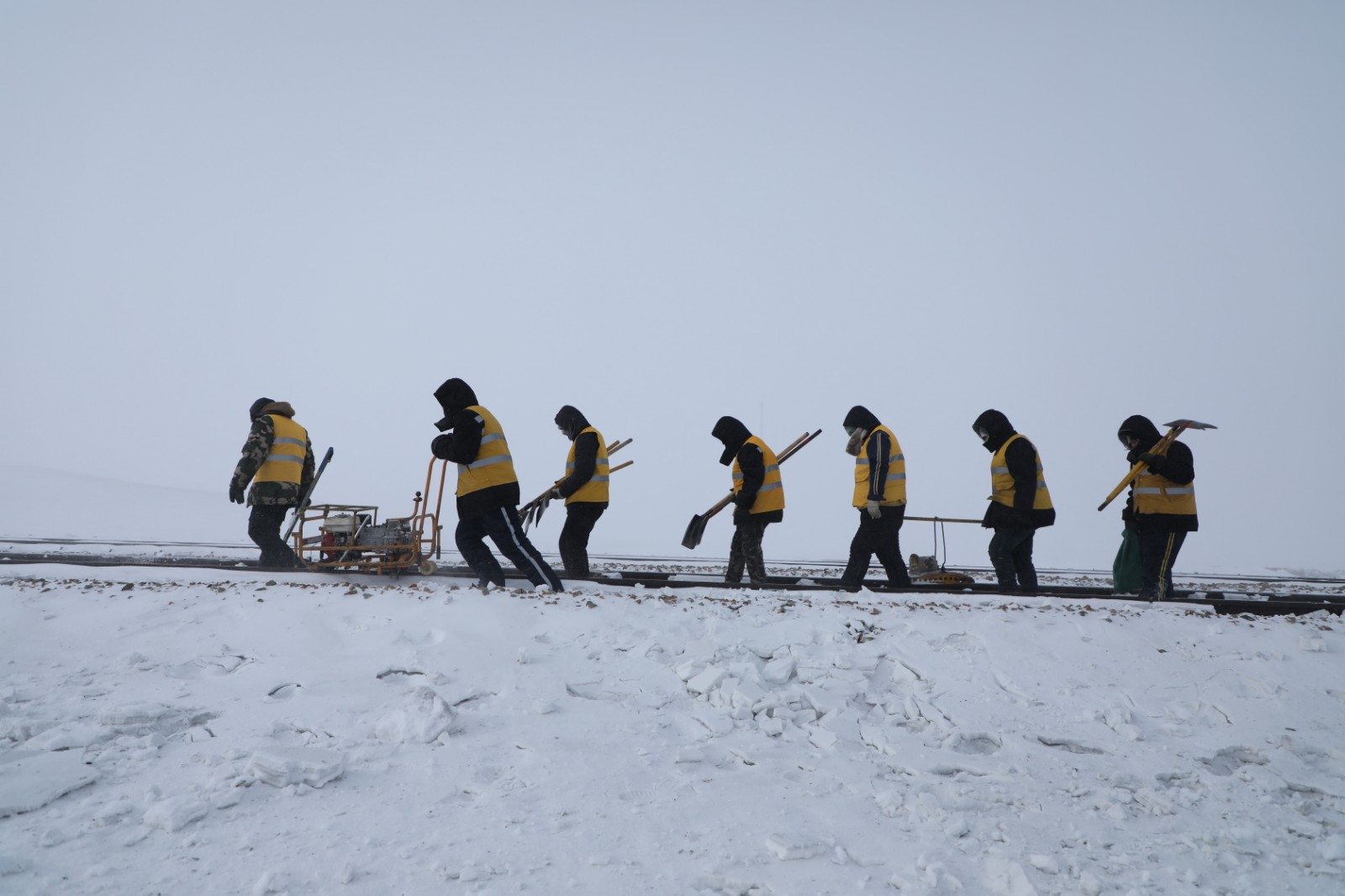 图为1月6日,中国铁路呼和浩特局集团公司锡林浩特综合维修段工人在严寒中检查维护铁路。 (人民日报客户端内蒙古频道 张枨 杨庆臣)