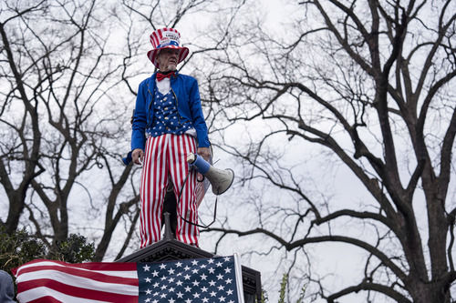 数以万计的示威者围堵在国会大厦附近,有人挥舞着美国国旗或自制旗帜,有人高喊口号。不少人装扮“抢眼”,还有人脸上涂抹着颜料。