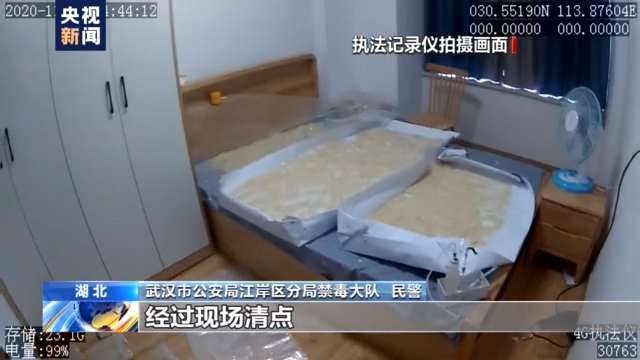 武汉市公安局江岸区分局禁毒大队 民警:在其家中的卧室里,我们发现在床上、地上都铺满了塑料布,上面全部都是毒品冰毒,据嫌疑人交代,这些都是刚刚从广东运回的高纯度冰毒,正在用空调和电吹风吹干。经过现场清点,我们发现一共有毒品12公斤。