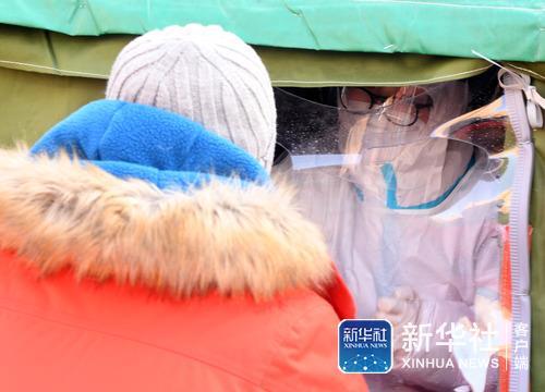 ↑1月6日,在沈阳市和平区马路湾街道电业社区南京一校振兴街分校检测点,工作人员的护目镜上结了冰霜。当日沈阳最低气温达到零下24摄氏度。新华社记者杨青摄