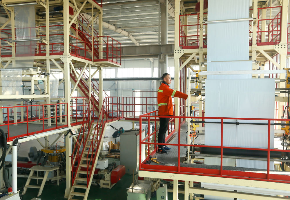 图为青岛一家生产可降解塑料袋企业的工人在生产线上工作(梁孝鹏 摄)