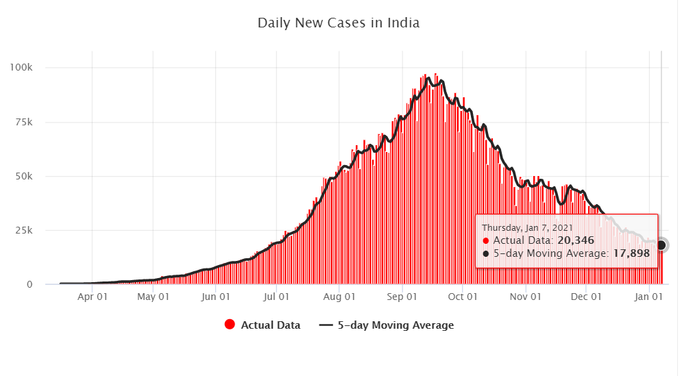 据印度卫生部当地时间1月7日8时(北京时间10时30分)发布的消息,印度新冠肺炎确诊病例累计达10395278例,其中死亡病例150336例,治愈出院10016859例,现存活跃病例228083例。