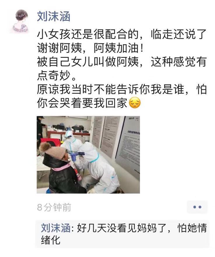 如今,刘沫涵又投入到了沈阳第二轮全员核酸采样工作中。“我欠女儿一个拥抱,等沈阳‘好起来’,就还给她。”