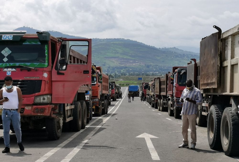 2020年8月31日,运输汽车在埃塞俄比亚英多得货场排队等待装运抵达的物资。新华社发(唐勇成 摄)