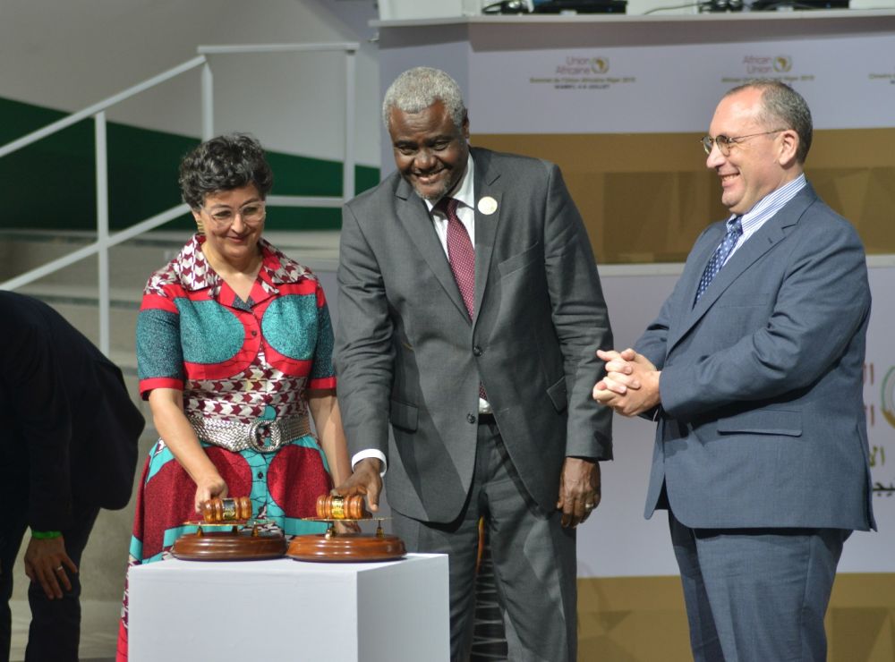 2019年7月7日,在尼日尔首都尼亚美,时任非盟轮值主席、埃及总统塞西(中)、非盟委员会主席法基(左)、尼日尔总统伊素福为非洲大陆自贸区揭牌。新华社发