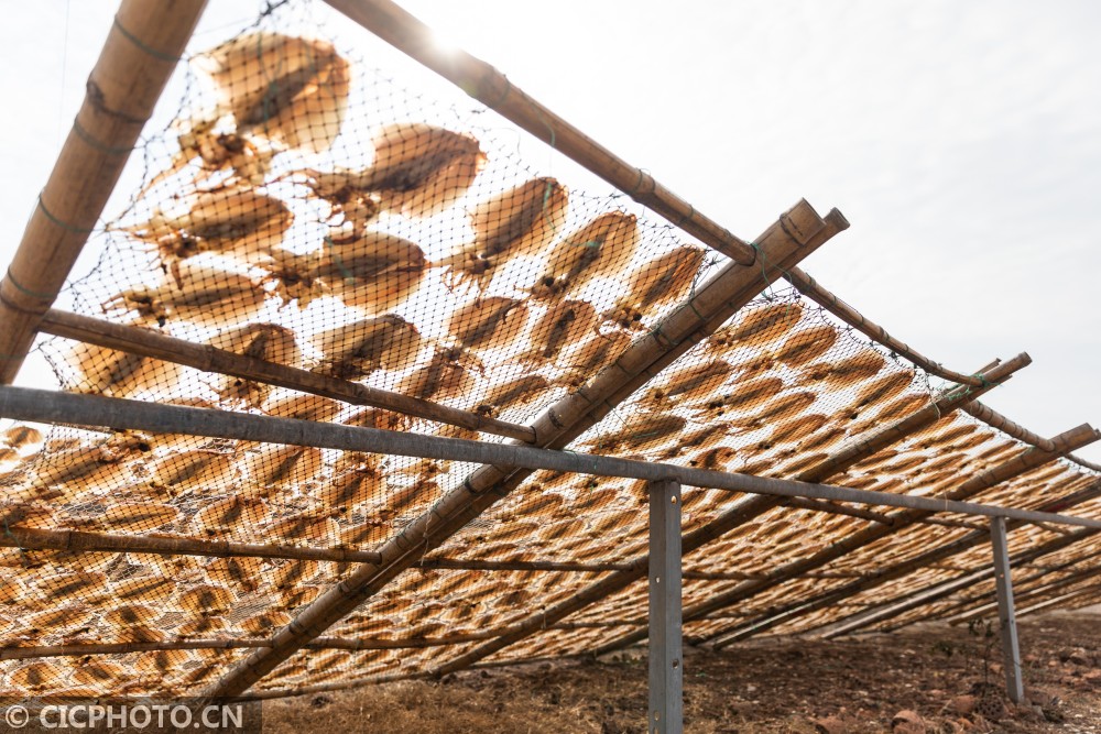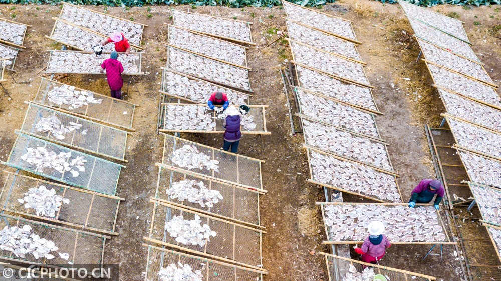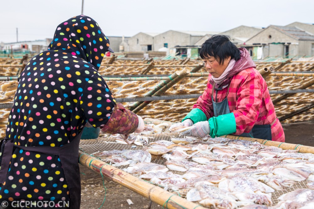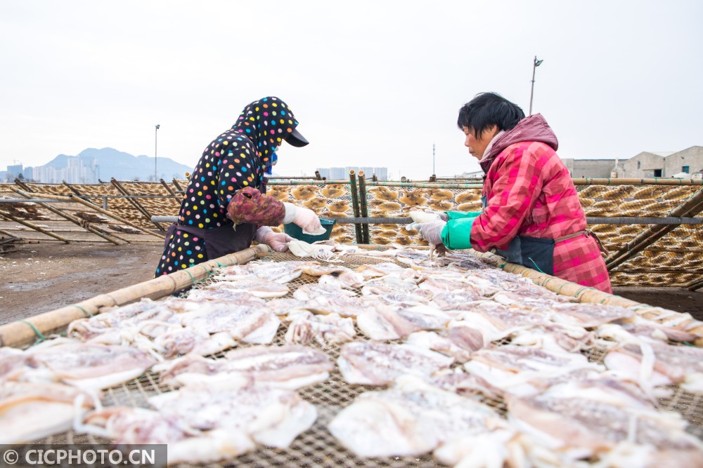 以上图片:2021年1月6日,浙江省温岭市松门镇鱼鲞晒场,渔民在晾晒海鲜。CICPHOTO/徐伟杰 摄