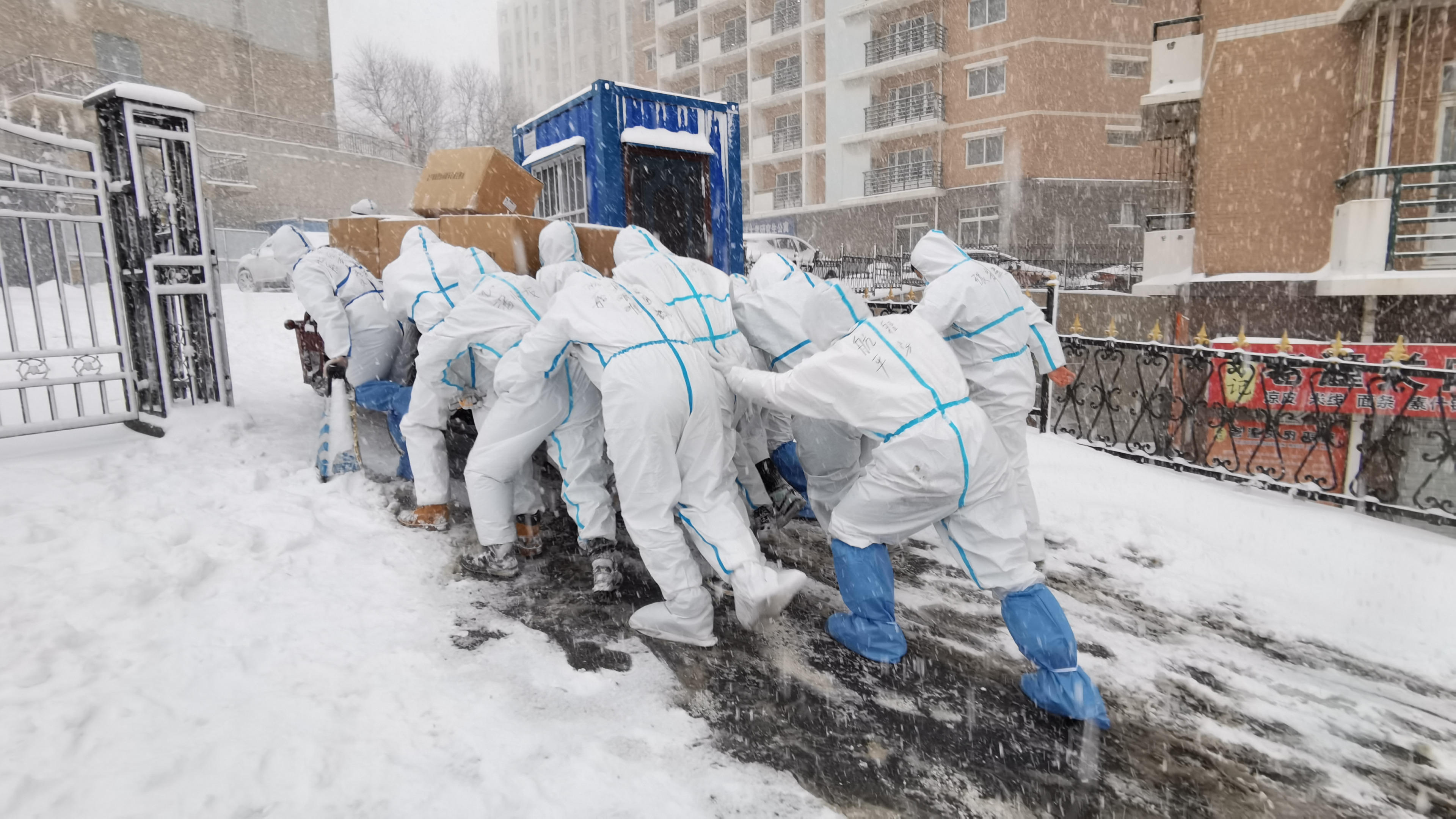 1月6日下午,一段视频在网上迅速被转发。十几个人推着一辆满载货物的三轮车在漫天飞雪中前行,队尾的几个人滑倒了,又艰难爬起,身上的防护服仿佛与天地融为一体。“笑着笑着就哭了”“因为总有这样一群人在,没有一个冬天不可逾越”……视频感动了万千网友。