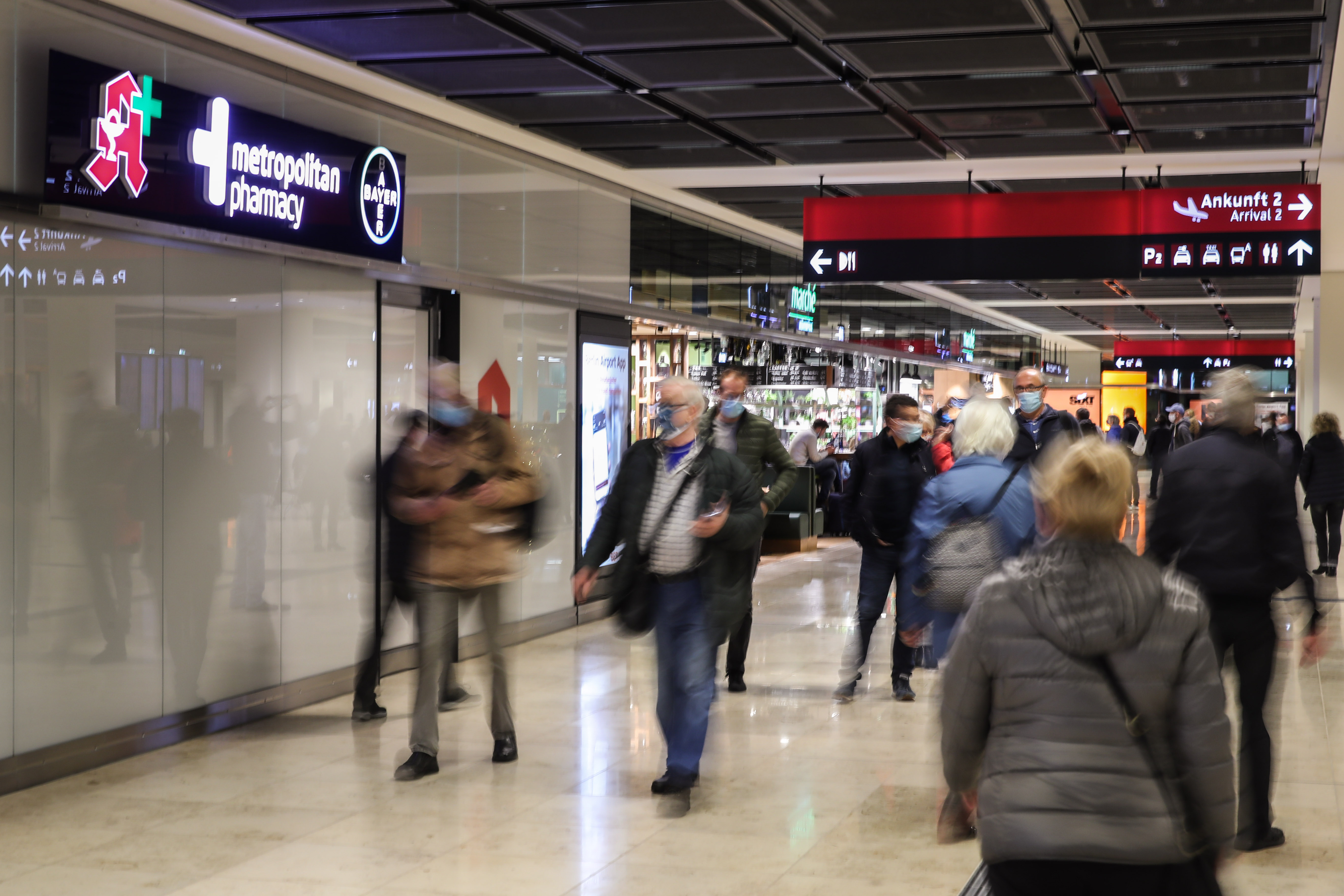 图为人们走在柏林南郊的柏林-勃兰登堡机场内一处购物区