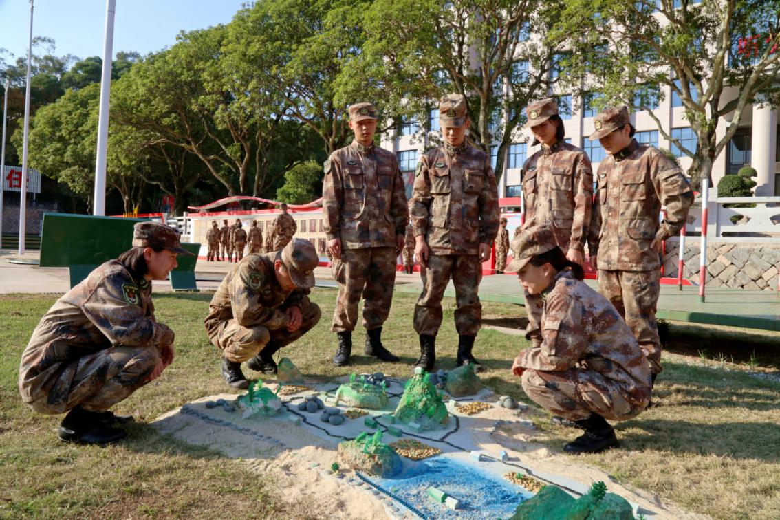 ↑官兵们在用海岛石堆砌的海岛模型前驻足观看