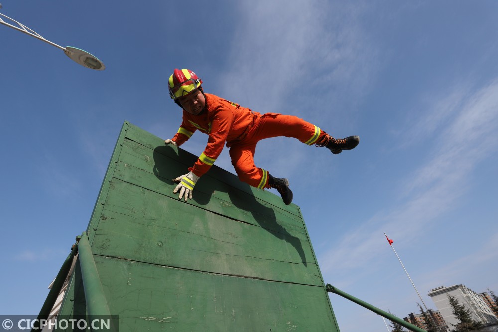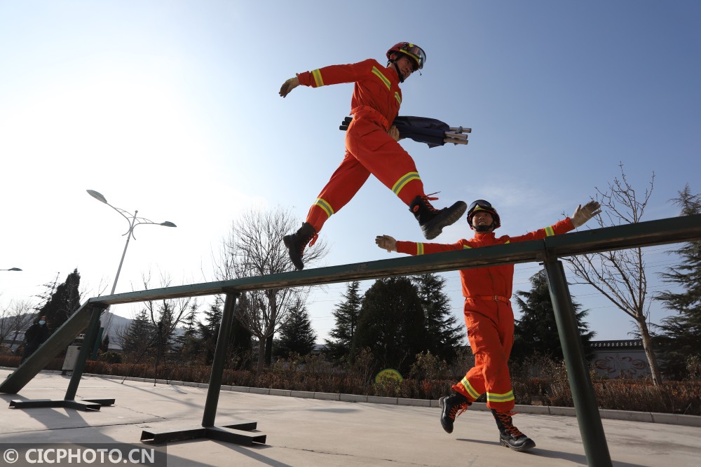 ↑2021年1月6日,甘肃省平凉市泾川县消防救援大队的消防员进行百米障碍救助操训练。CICPHOTO/吴希会 摄