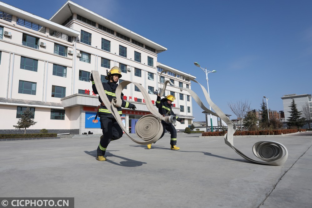↑2021年1月6日,甘肃省平凉市泾川县消防救援大队的消防员进行抛水带训练。CICPHOTO/吴希会 摄