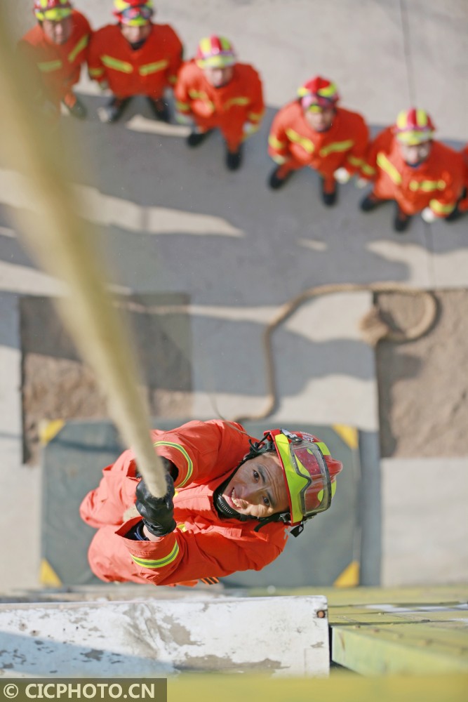 ↑2021年1月6日,甘肃省平凉市泾川县消防救援大队的消防员进行绳索攀爬训练。CICPHOTO/吴希会 摄