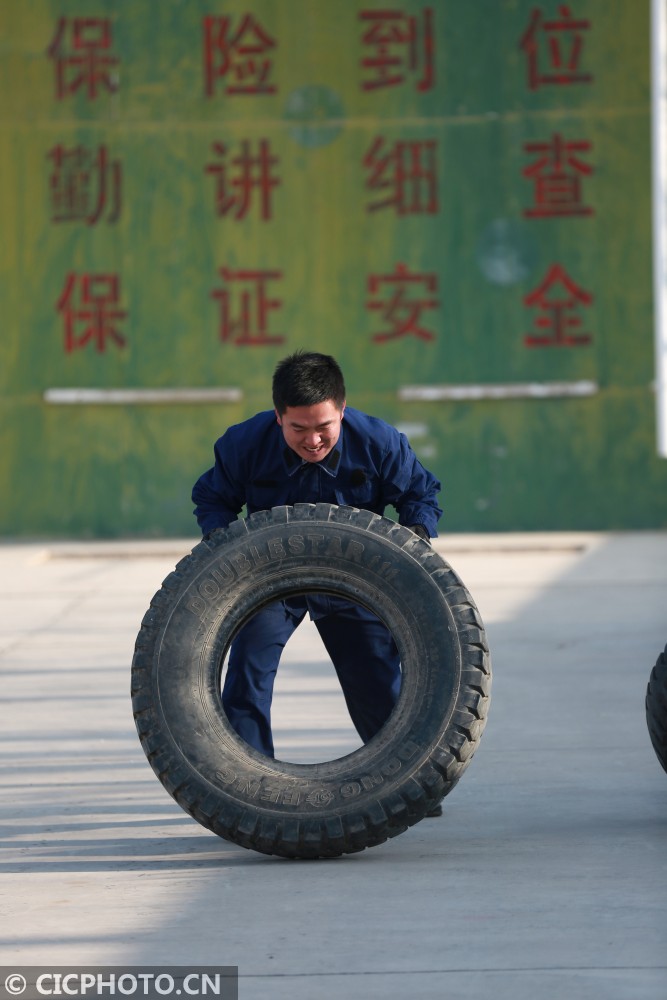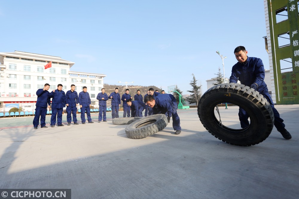↑2021年1月6日,甘肃省平凉市泾川县消防救援大队的消防员进行翻轮胎训练。CICPHOTO/吴希会 摄