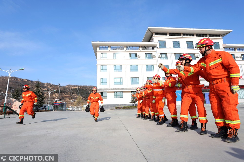 ↑2021年1月6日,甘肃省平凉市泾川县消防救援大队的消防员进行搬运重物折返跑训练。CICPHOTO/吴希会 摄