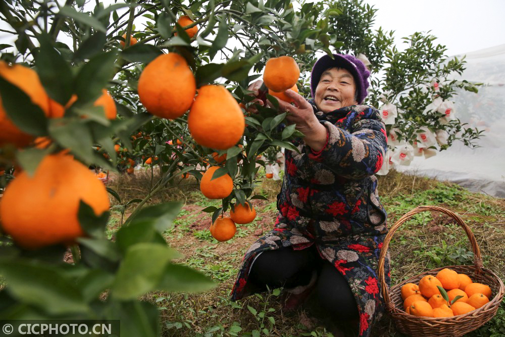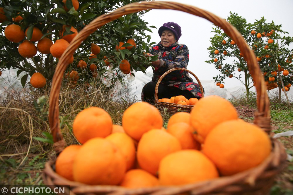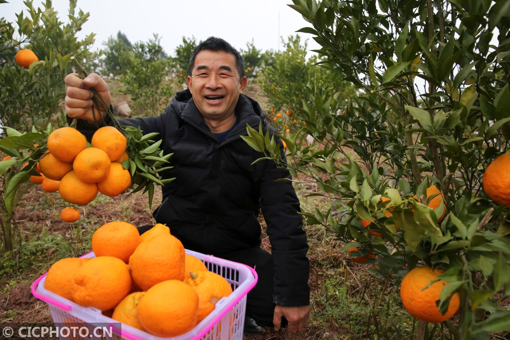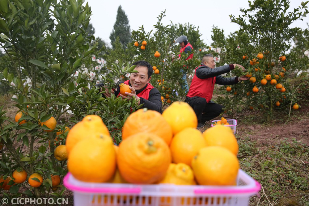 ↑2021年1月6日,四川省内江市东兴区双才镇高屋村的果农在扶贫产业项目基地采摘柑橘。CICPHOTO/兰自涛 摄