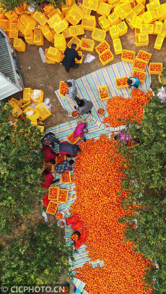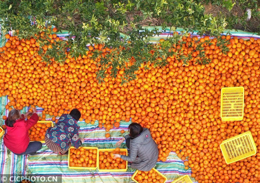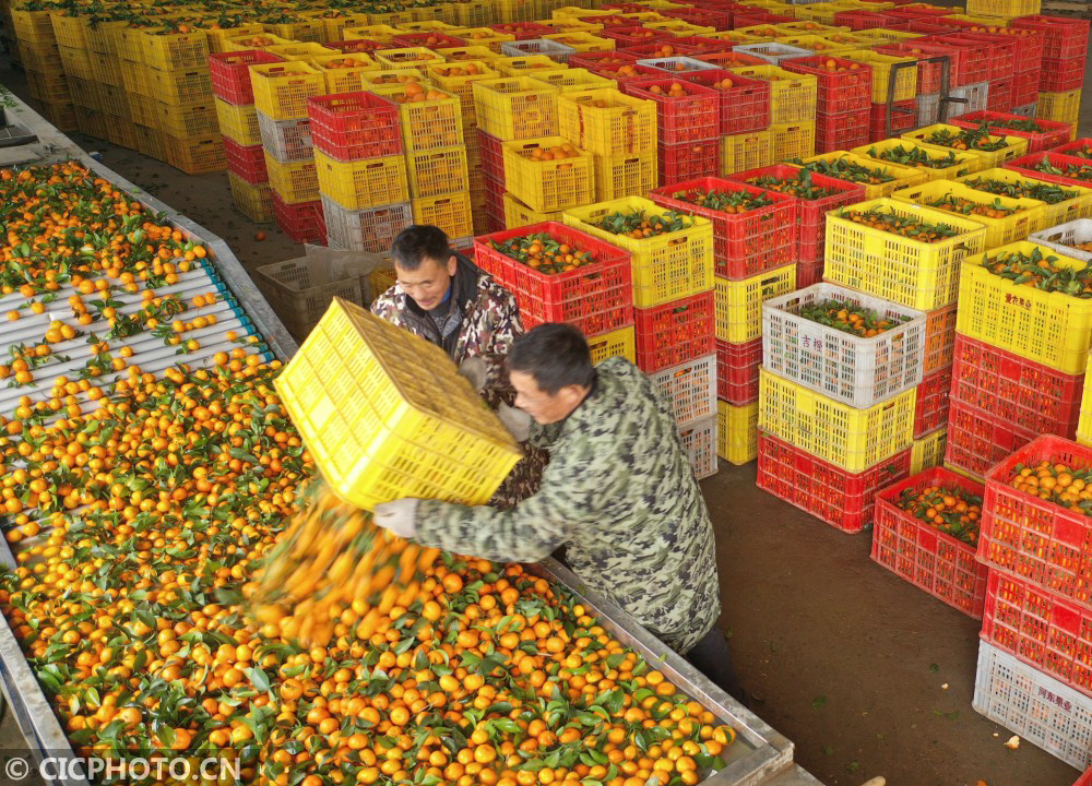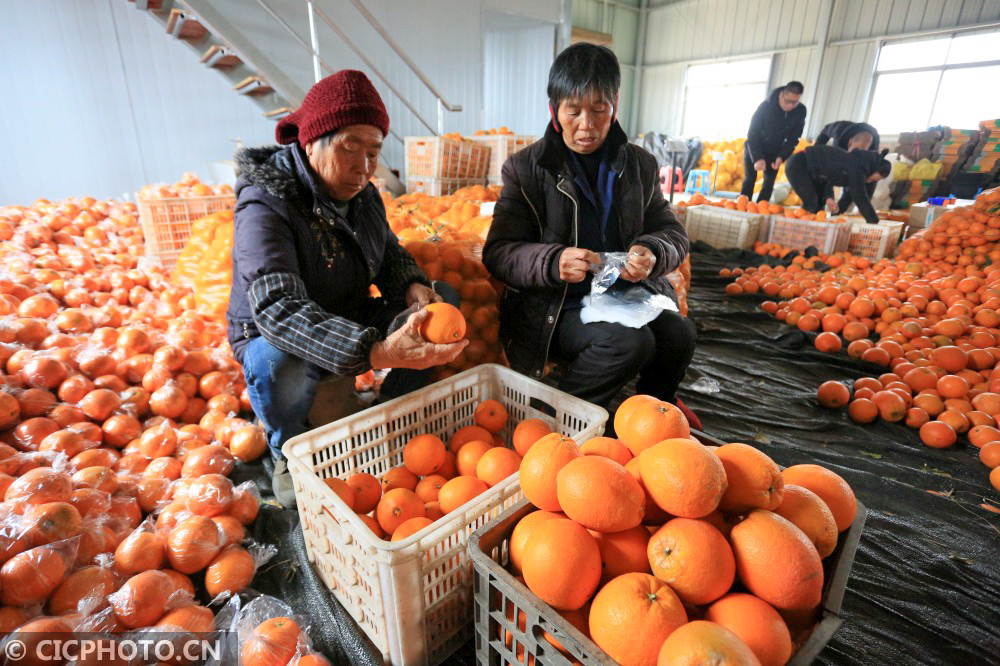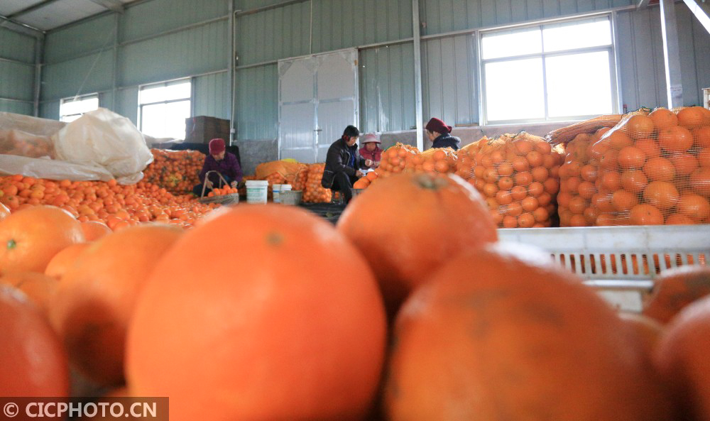 ↑2021年1月5日,江西省抚州市金溪县合市镇杭桥村的果农在村集体经济基地分拣香橙。CICPHOTO/邓兴东 摄
