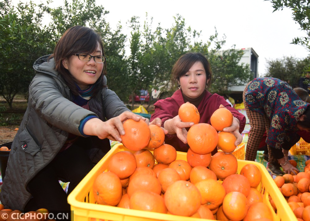 ↑2021年1月5日,在江西省抚州市金溪县合市镇杭桥村的果农在村集体经济基地分拣香橙。CICPHOTO/邓兴东 摄