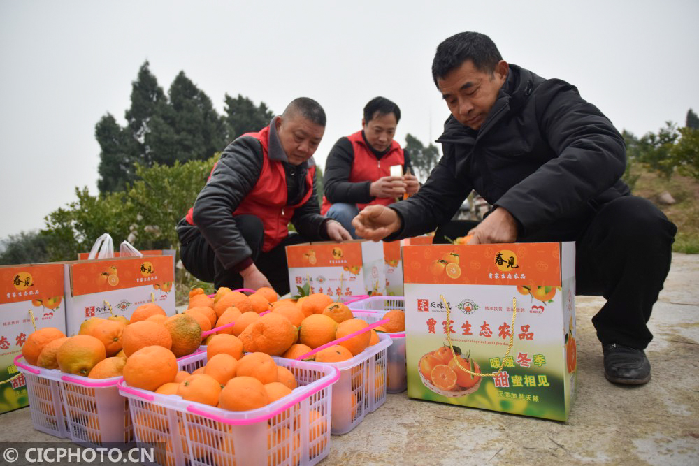 ↑2021年1月6日,四川省内江市东兴区双才镇高屋村第一书记陈建国(中)和果农在扶贫产业项目基地包装柑橘。CICPHOTO/唐明润 摄