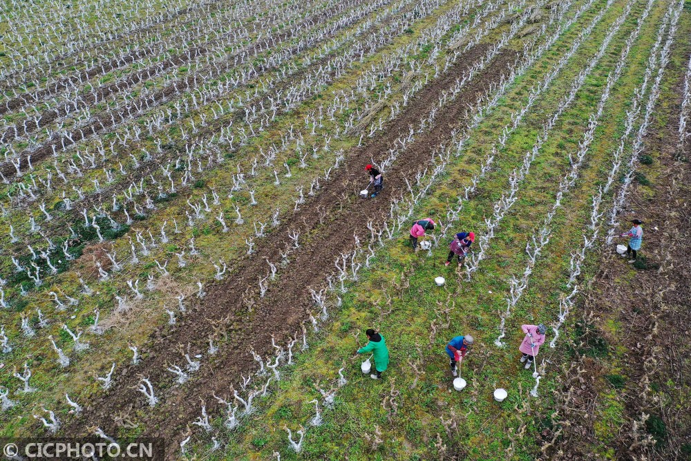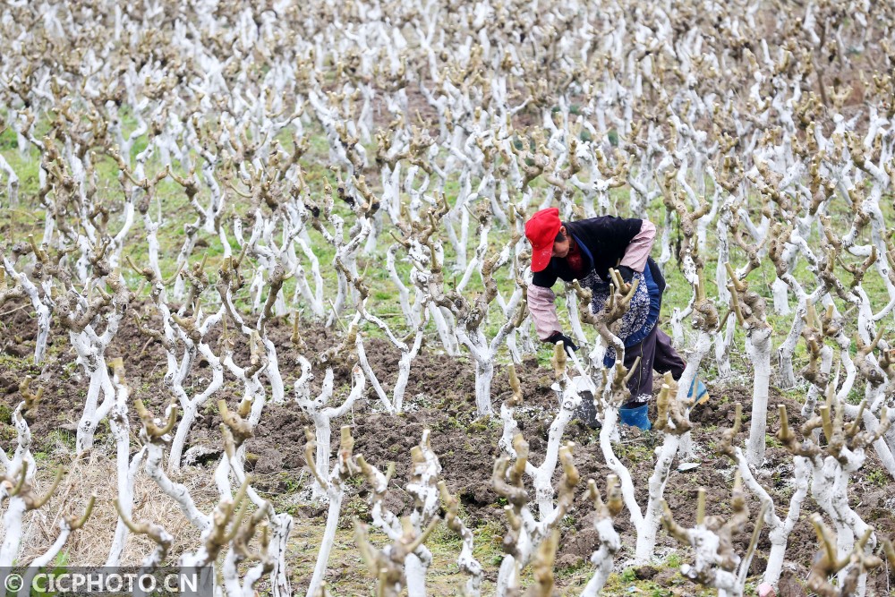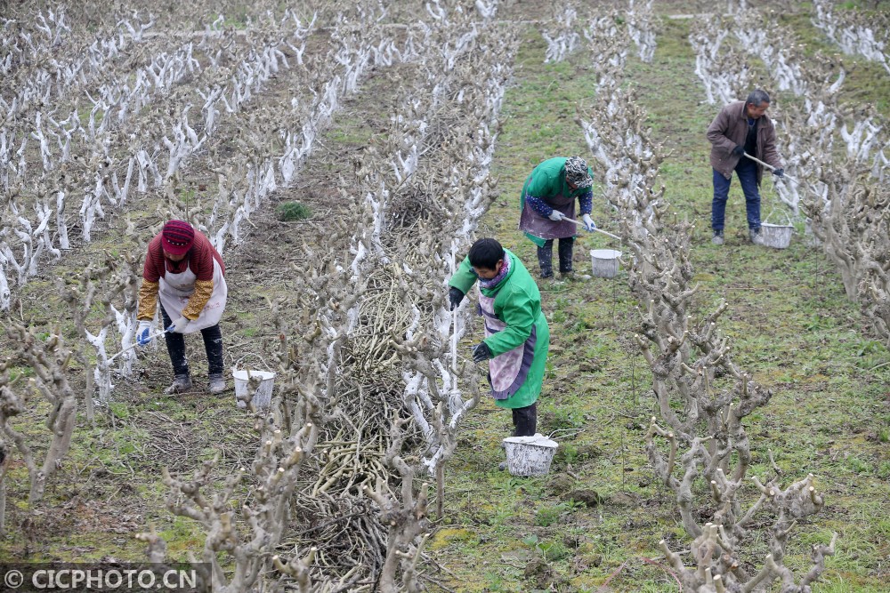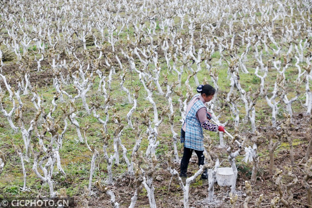 以上图片:2021年1月5日,在重庆市黔江区濯水镇一蚕桑基地,农民在给桑树刷防虫石灰水。CICPHOTO/杨敏 摄