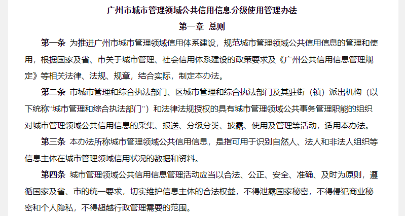 根据广州市城市管理综合执法局通报,为规范城市管理领域公共信用信息的管理和使用,《广州市城市管理领域公共信用信息分级使用管理办法》(以下简称《办法》)已于日前发布,并将于3月1日正式施行,有效期为3年。《办法》结合城市管理工作特点,探索按失信行为性质严重程度对失信信息进行等级划分,为广州市城管领域失信主体的分类管理提供条件。
