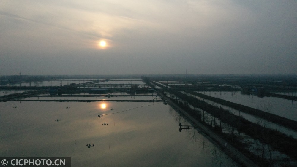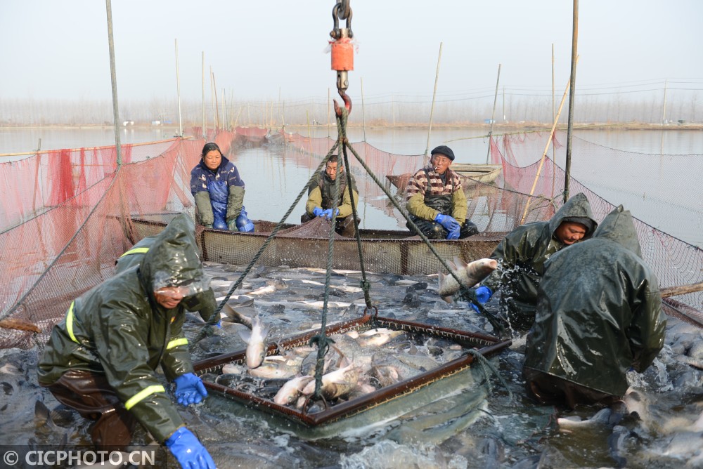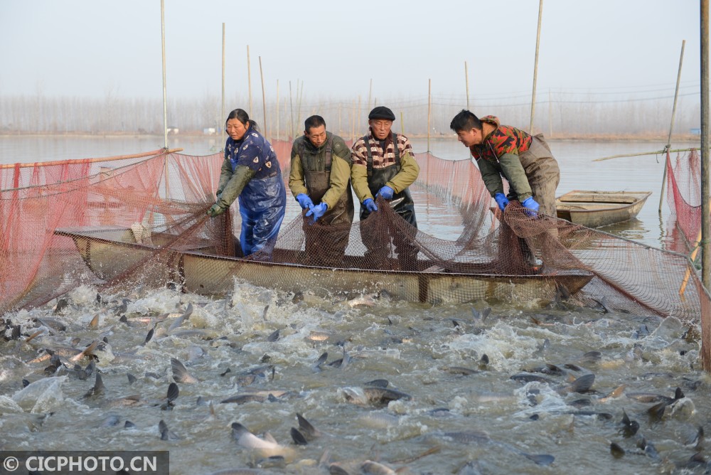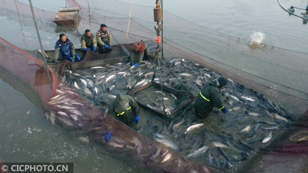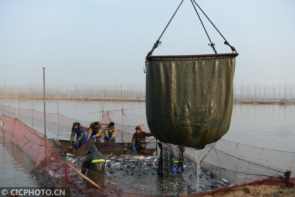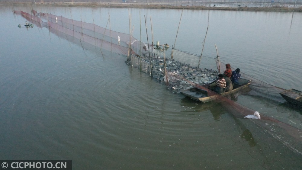 以上图片:2021年1月6日,渔民们在江苏省淮安市洪泽区一渔业产业园鱼塘内拉网捕鱼。CICPHOTO/刘宇 摄