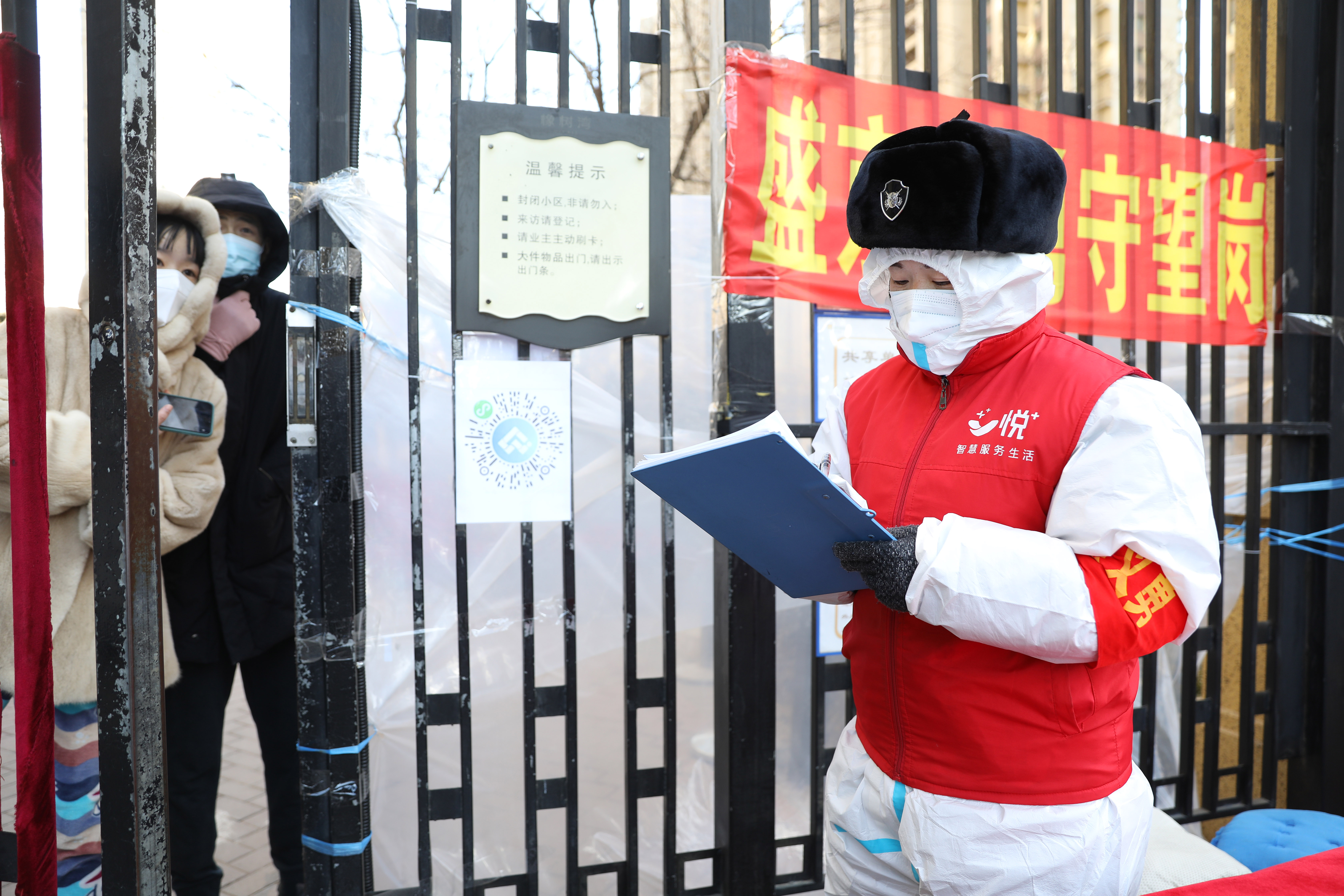 1月7日,在沈阳市中风险地区于洪区华润橡树湾二期的门前,工作人员王兰(右)在登记居民所缺物资。