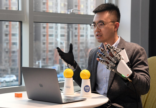 富伯(北京)医疗科技有限公司总经理孔令杰通过视频直播的方式展示外骨骼机器手(新华社记者任超1月5日摄)