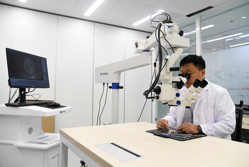 超目科技(北京)有限公司创始人王乐今借助显微镜调试产品(新华社记者任超1月5日摄)
