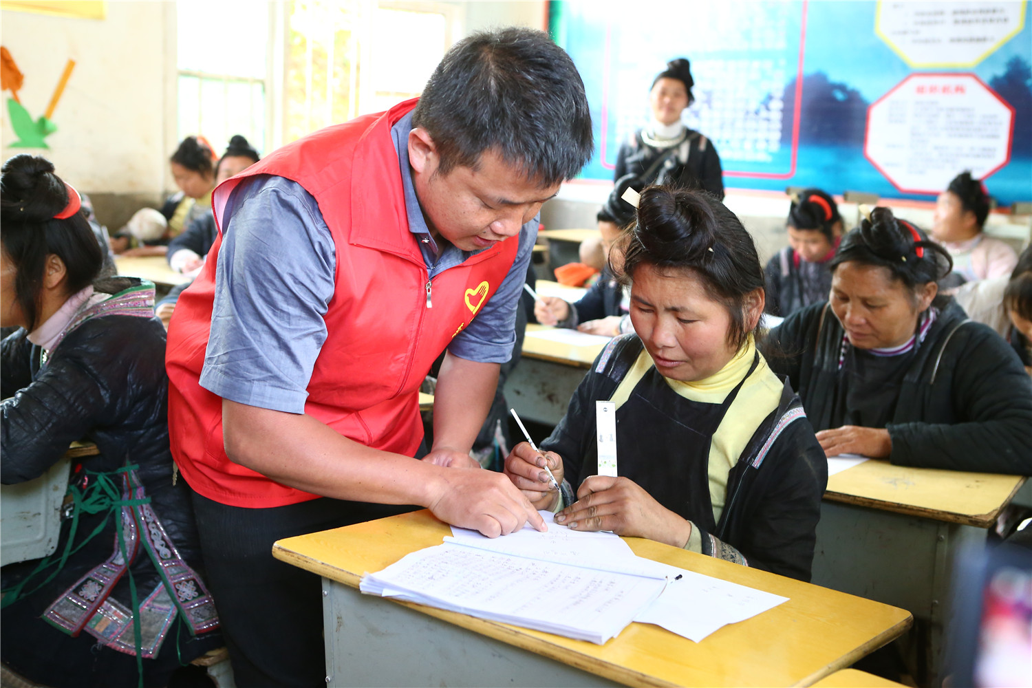 青年志愿者在贵州教苗族同胞读书认字(资料图片)。新华社发