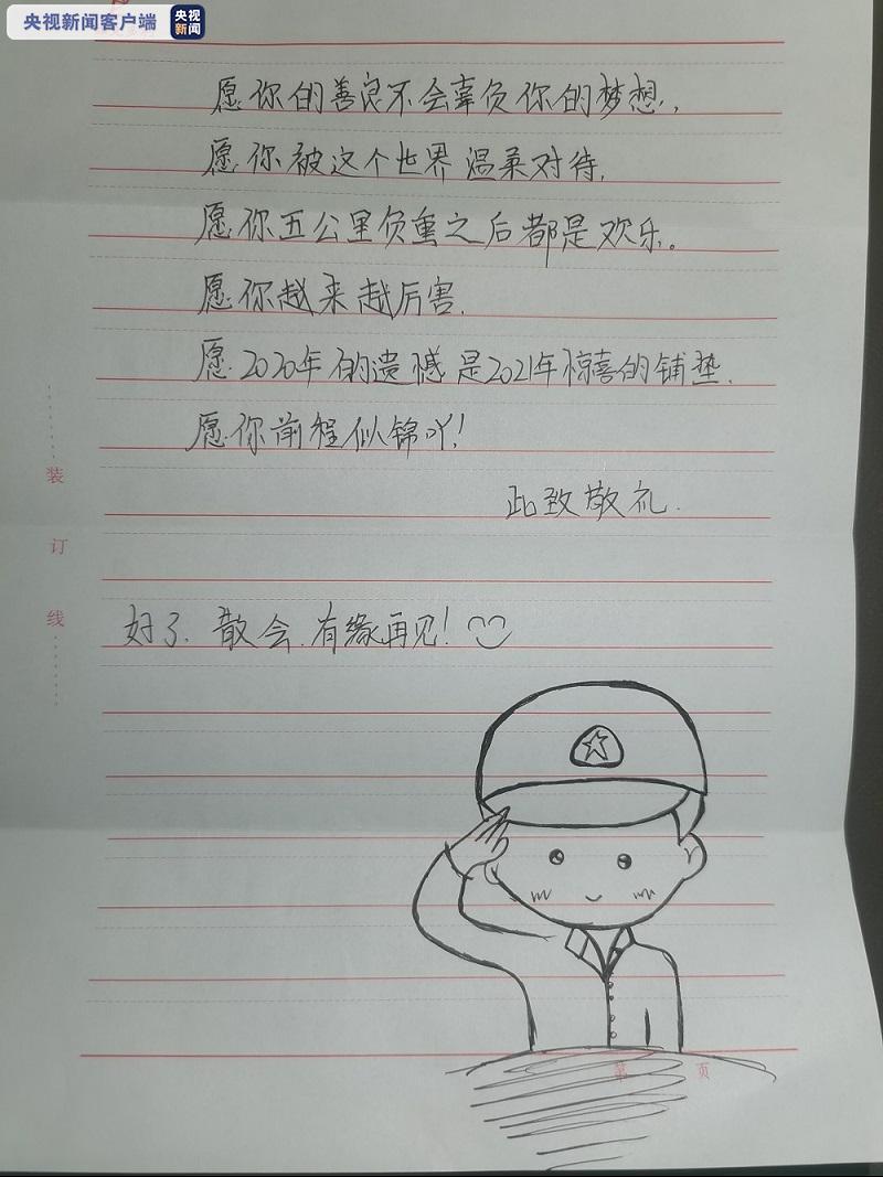 一字一句都表达着两个姑娘对执勤官兵和祖国的祝福,如同一股暖流温暖了这个寒冬。收到礼物的官兵说,感谢人民群众的关心与支持,也祝福大家平安快乐,我们定会将祝福传达至每一名官兵,也将始终用自己的使命和担当,保卫人民安康。(总台央视记者 赵钱江 李浩男)