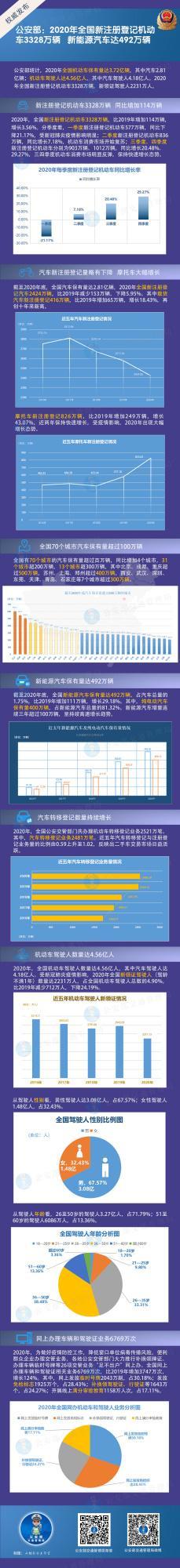 中新网北京1月7日电(记者 张子扬)据公安部统计,2020年全国机动车保有量达3.72亿辆,其中汽车2.81亿辆;机动车驾驶人达4.56亿人,其中汽车驾驶人4.18亿人。2020年全国新注册登记机动车3328万辆,新领证驾驶人2231万人。