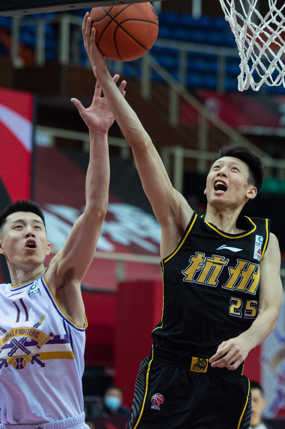 1月7日,浙江广厦控股队球员赵岩昊(右)在比赛中面对北京紫禁勇士队球员侯逸凡的防守上篮。新华社发(江汉摄)