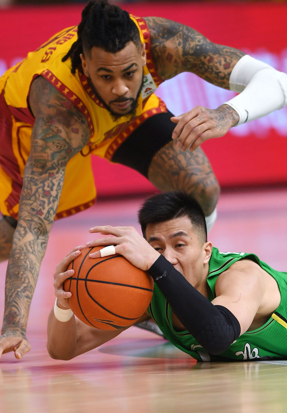 1月7日,辽宁本钢队球员郭艾伦(下)与山西汾酒股份队球员莫兰德在比赛中拼抢。新华社记者 李紫恒 摄